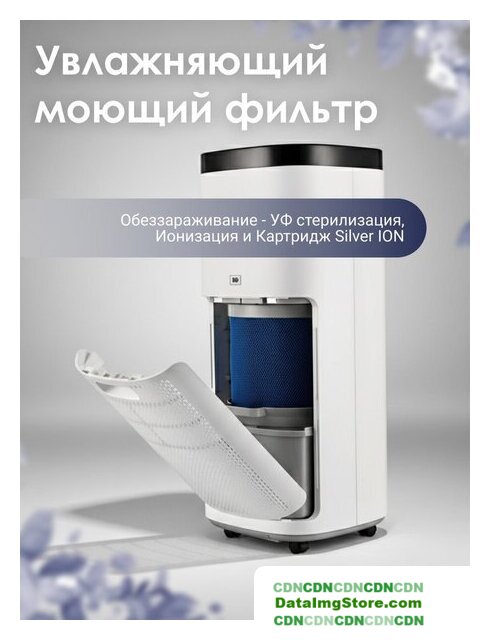 мойка воздуха, расход воды до 350 мл/ч, для помещения до 50 м², шум 43 дБ, питание: сеть, цвет белый