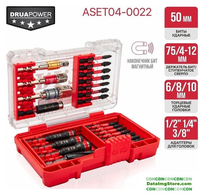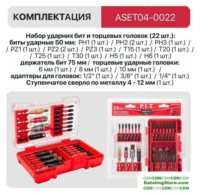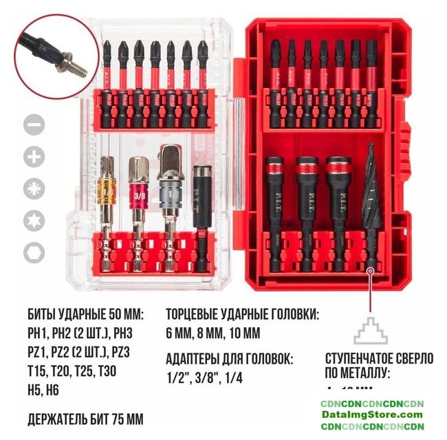 | Комплектация | Биты ударные 50 мм (14 шт.), головки торцевые ударные (3 шт.), держатель бит, адаптеры для торцевых головок (3 шт.), ступенчатое сверло по металлу, пластиковый кейс |