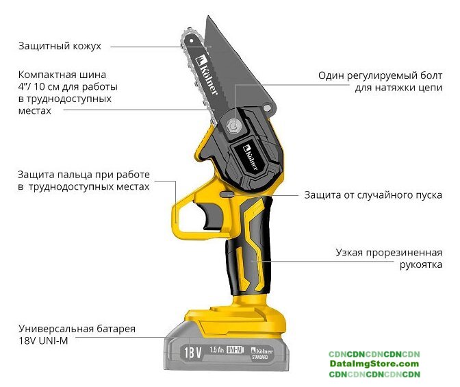 аккумуляторная, бытовая, 0.35 кВт, 21 В, шаг цепи: 1/4 дюйма, длина шины: 10 см, аккумулятор в комплекте, 2.4 кг