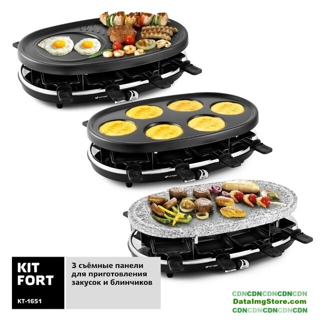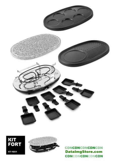 | Комплектация | Раклетница — 1 штПанель с антипригарным покрытием — 2 штКаменная плита — 1 штПорционные сковородки с антипригарным покрытием — 8 штРуководство по эксплуатации — 1 штГарантийный талон — 1 шт |