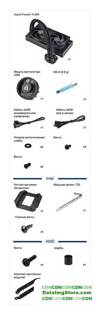 | Комплектация | 1x Liquid Freezer III 2801x Модуль вентилятора VRM1x MX-6 (0.8 g)1x Кабель ШИМ (индивидуальное управление) 1x Кабель ШИМ (все в одном) 8x Плоские металлические шайбы16x ВинтыIntel1x Контактная рамка процессора 1x Ведущая деталь T204x Упорные винтыAMD4x Винты4x Шайбы1x Комплект монтажных модулей |