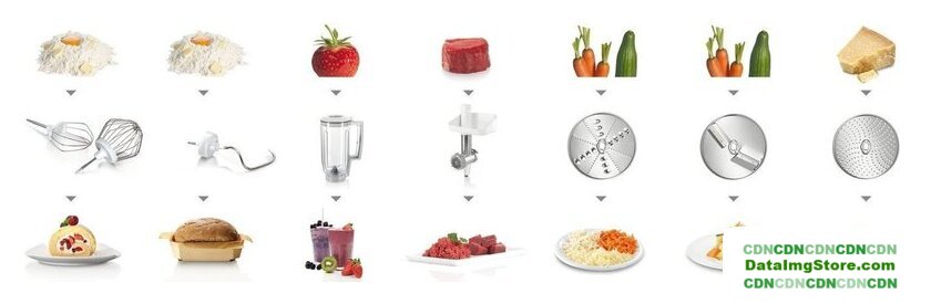 | Функции | мясорубка, блендер, взбивание, смешивание, замешивание дрожжевого теста, терка, шинковка, ломтерезка |