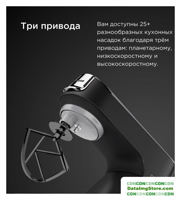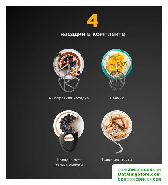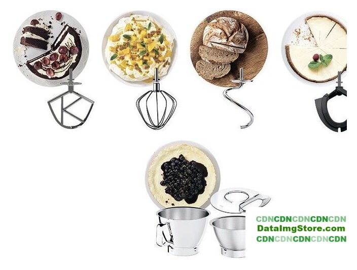 | Полная комплектация | венчик, крюк для теста, К-образная насадка, насадка гибкий-взбиватель, защитная крышка, лопатка, 2 чаши. |