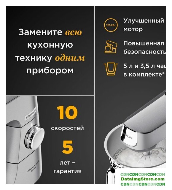 1200 Вт, планетарное смешивание, объем чаши: 5.5 л, терки, мясорубка, блендер