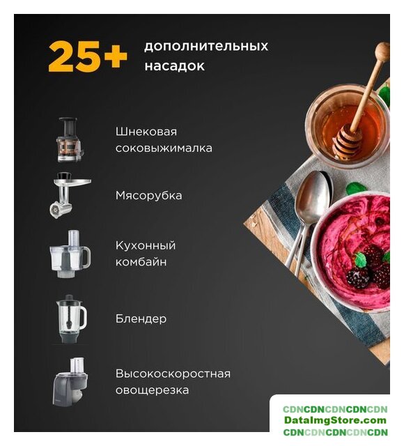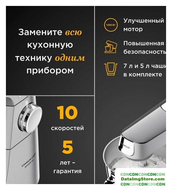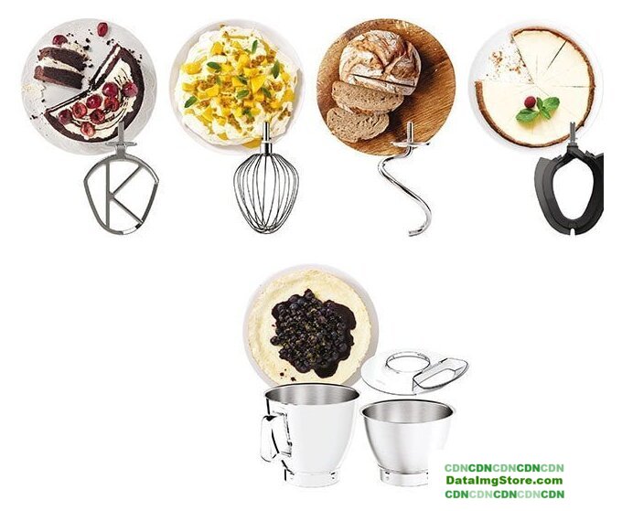 1200 Вт, планетарное смешивание, объем чаши: 5.5 л, терки, мясорубка, блендер
