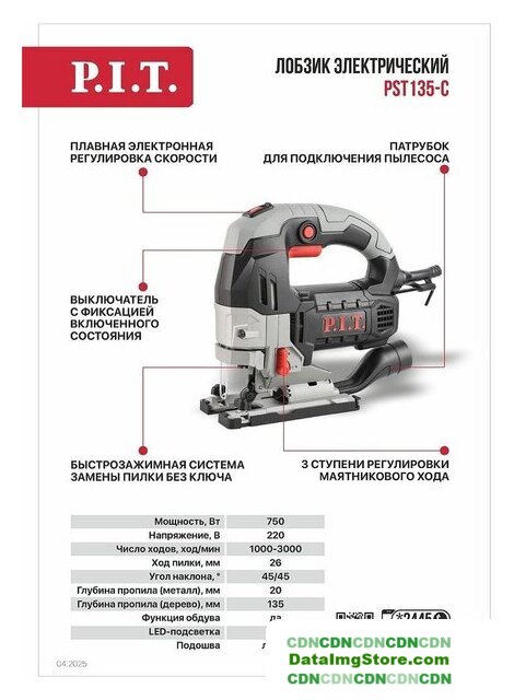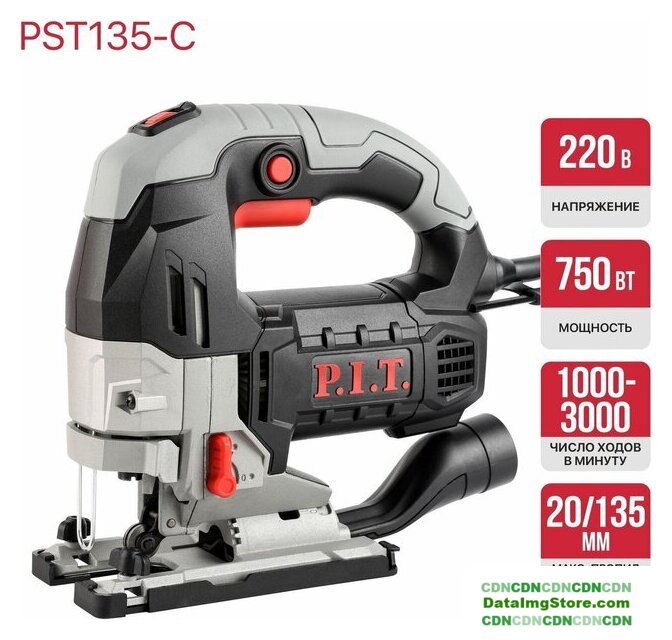 рукоятка-скоба, питание: сеть, 750 Вт, глубина пропила: 135 мм (дерево), 10 мм (сталь), 1000–3000 ходов/мин, ход пилки: 26 мм, 3.22 кг