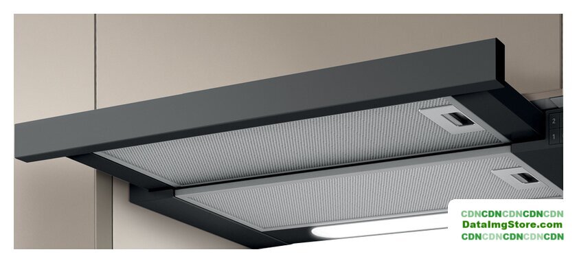 конструкция скрытая, монтаж для встраивания, ширина 52 см, управление электронное/кнопочное, производительность мотора 800 м³/ч, цвет черный