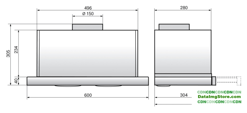 конструкция скрытая, монтаж для встраивания, ширина 52 см, управление механическое/кнопочное, производительность мотора 850 м³/ч, цвет белый