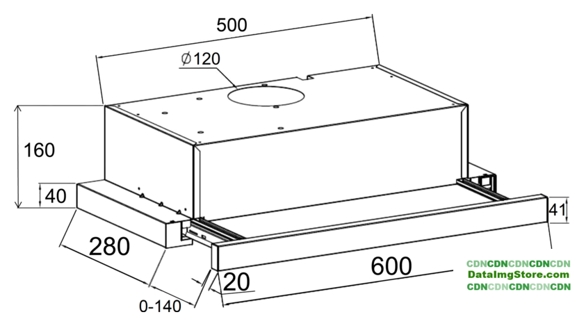 конструкция телескопическая, монтаж для встраивания, ширина 59.5 см, управление механическое/кнопочное, производительность мотора 750 м³/ч, цвет черный