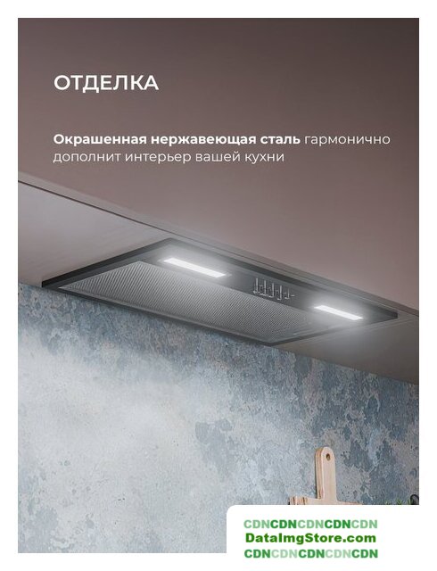 конструкция плоская, монтаж настенный, ширина 49.5 см, управление механическое/кнопочное, производительность мотора 400 м³/ч, цвет нержавеющая сталь