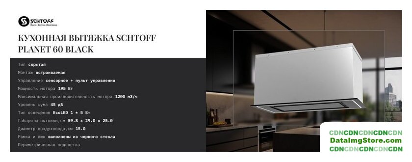 конструкция скрытая, монтаж для встраивания, ширина 59.8 см, управление сенсорное/дистанционное, производительность мотора 1020 м³/ч, цвет черный