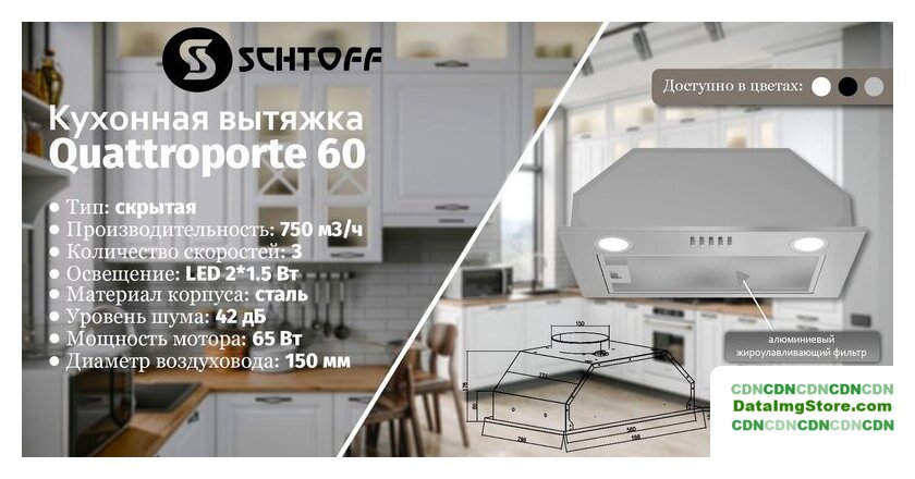конструкция наклонная, монтаж настенный, ширина 60 см, управление механическое/кнопочное, производительность мотора 750 м³/ч, цвет черный