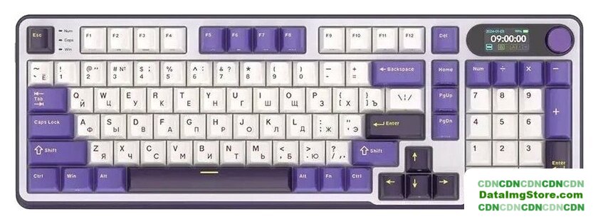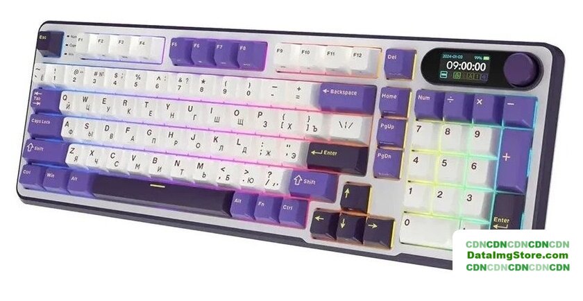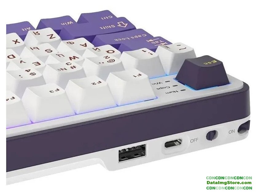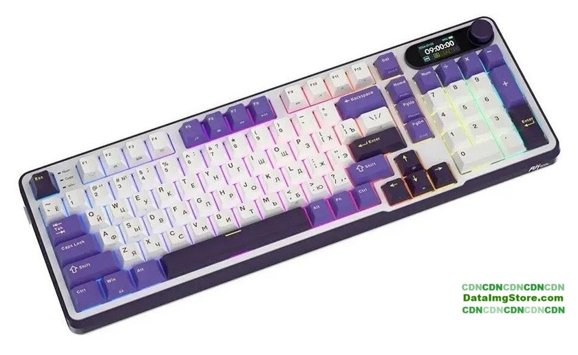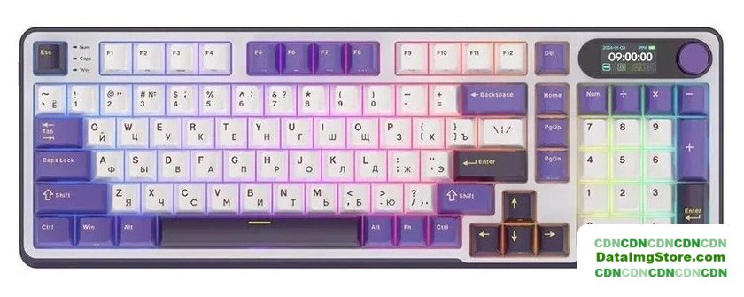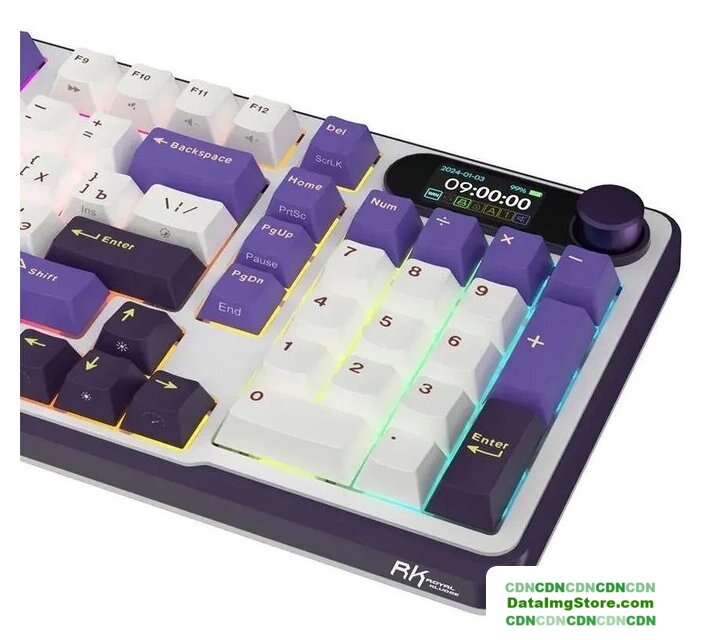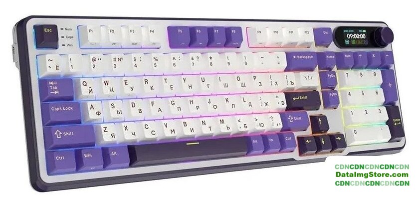 игровая для ПК, механическая, RK Chartreuse, ход линейный, пластик, интерфейс подключения - USB-A/радио/Bluetooth/USB-C, кириллица: да, USB-хаб, цвет белый/темно-синий/фиолетовый