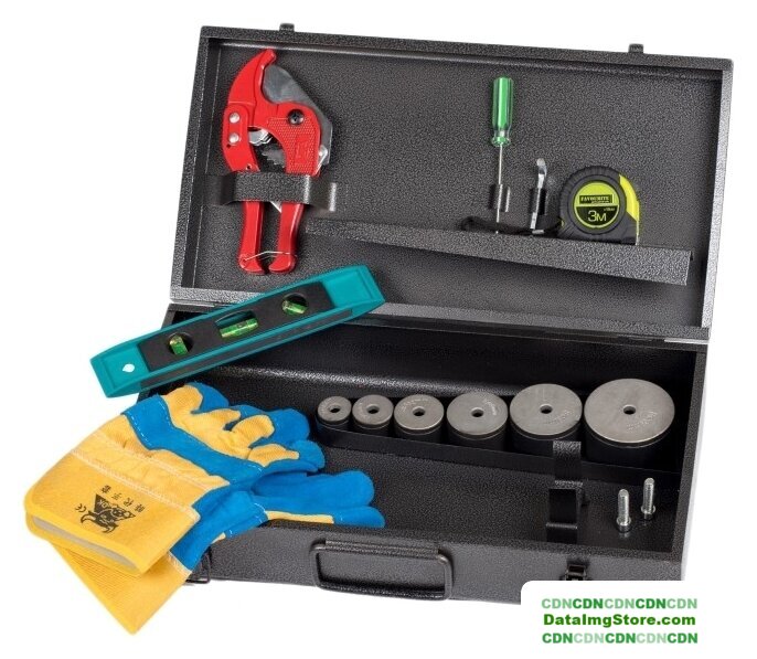 | Комплектация | 6 насадок (20, 25, 32, 40, 50, 63 мм), ножницы, 6-гранный ключ, рулетка, отвертка, перчатки, уровень, металлический кейс |