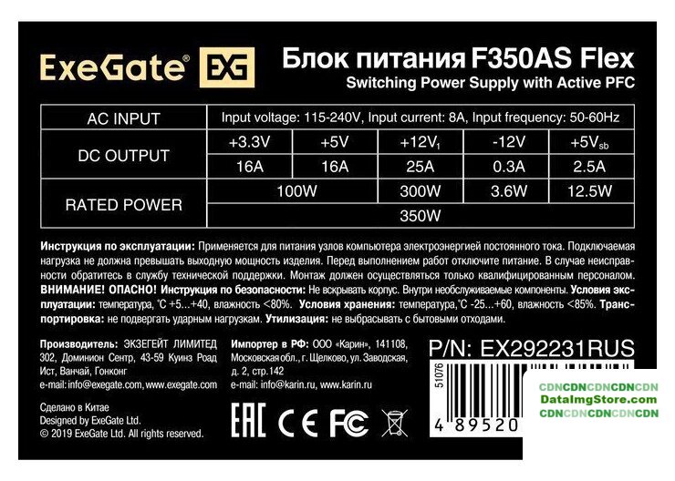 | Комбинированная нагрузка по +12V | 300 Вт |