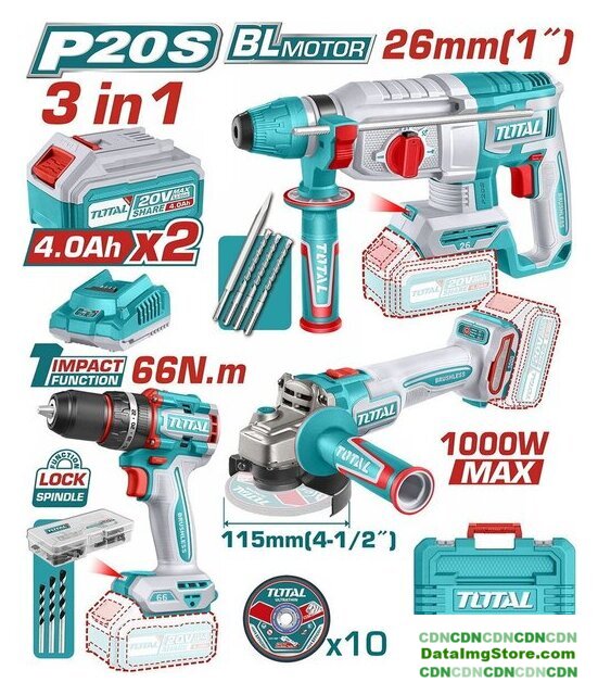 | Комплектация | Дрель-шуруповерт ударная TOTAL TIDLI206681 - 1 шт.Углошлифмашина аккумуляторная TOTAL TAGLI27153 - 1 шт.Перфоратор аккумуляторный TOTAL TRHLI16168 - 1 шт.Акукумулятор 4,0 Ач TFBLI20021 - 1 шт.Зарядное устройство TFCLI2001 - 1 шт.Бур - 3 шт.Долото - 1 шт.Отрезные диски по металлу - 10 шт.Аксессуары к дрели-шуруповерту - 47 шт.ИнструкцияКоробка |