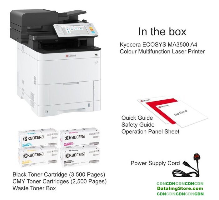 | Комплектация | Kyocera ECOSYS MA3500cixСтартовый черный картридж с тонером (3500 страниц)Стартовые цветные картриджи с тонером (2500 страниц)Ящик для отработанного тонераКраткое руководствоРуководство по технике безопасностиЛист панели управленияШнур питания |