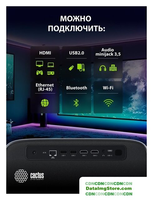 для домашнего кинотеатра, матрица LCD, FullHD (1920x1080), светодиодный, яркость 750 ANSI лм, контраст 1000:1, расстояние 1-7 м, экран 50-210", LAN, Wi-Fi