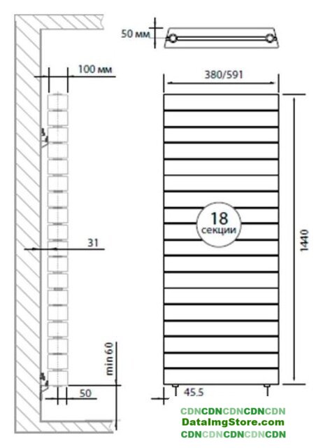 дизайн-радиатор, боковое подключение, ΔТ = 70 K: 1530 Вт, высота: 591 мм, межосевое расстояние: 500 мм, посадочный диаметр: 1"