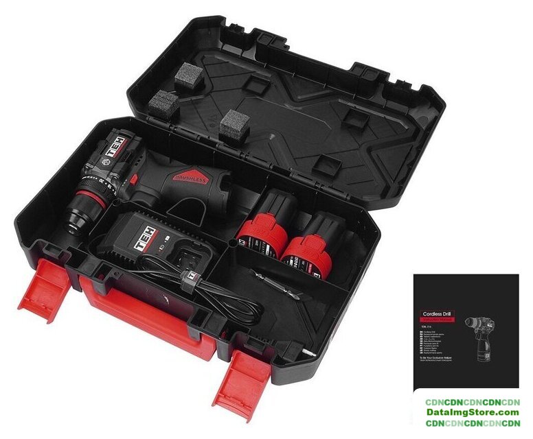 | Комплектация | - Дрель-шуруповерт;, - Аккумуляторная батарея - 2 шт.;, - Зарядное устройство;, - Руководство по эксплуатации;, - Кейс. |