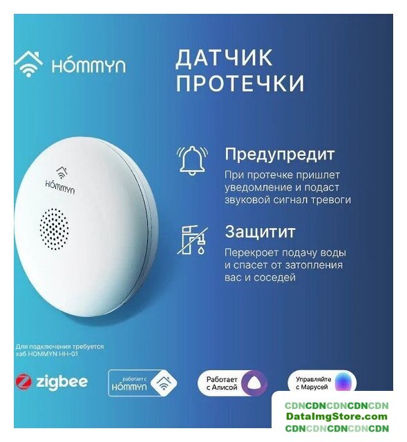 датчик протечки воды, подключение к Wi-Fi, соединение ZigBee, управление через Яндекс Алиса, размещение внутри помещения, питание: сеть 220В