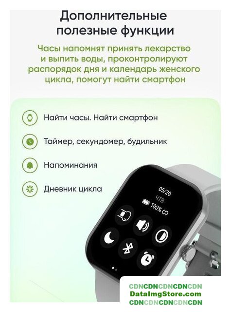 | Дополнительные функции | отслеживание сна, отслеживание женского здоровья, подсчет потраченных калорий, контроль частоты сердечных сокращений, таймер, секундомер, поиск смартфона, расписание занятий |