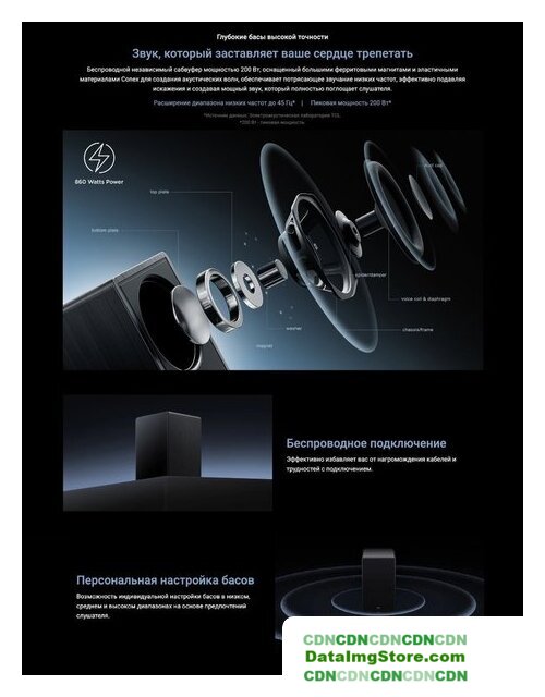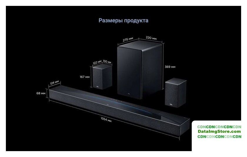 Комплект поставки | - звуковая панель- беспроводной сабвуфер- 2 тыловых колонки - пульт ДУ- 4 кабеля питания - набор для настенного крепежа- документация |