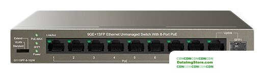 неуправляемый, настольный, матрица 7.6 Гбит/с, 5.65 Mpps, 8x100Mbit, 2xGbit, 1xSFP, PoE, бюджет 65 Вт