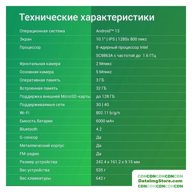 10.1" IPS (1280x800), Android, Spreadtrum SC9863A, 3 ГБ / 32 ГБ, Wi-Fi + сотовая связь (nanoSIM + nanoSIM), аккумулятор 6000 мАч