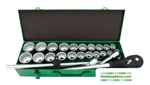 | Комплектация | - 22 торцевых 12-гранных головок: 22, 24, 27, 30, 32, 36, 38, 41, 46, 50 мм. 7/8,5/16, 1, 1-1/8, 1-3/16, 1-5/16, 1-3/8, 1-7/16, 1-5/8, 1-3/4,1-7/8,2 дюйма- 2 удлинителя размером на 100 и 200мм,- вороток с плавающей головкой размером 510мм- трещотка на 24 зубца. |