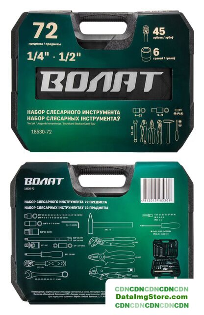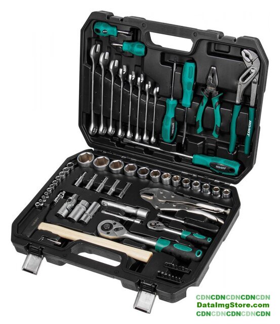 | Комплектация | Головка торцевая 1/4": 5, 6, 7, 8, 9 мм;Головка торцевая длинная 1/4": 6, 7, 8, 9, 10, 11, 12, 13 мм;Головка торцевая 1/2": 10, 11, 12, 13, 14, 15, 17, 19, 22, 24, 27, 30, 32 мм;Свечная головка 1/2": 16, 21 мм;Насадка 1/4" TORX: T10, T15, T20, T25, T27, T30, T40;Насадка 1/4" PH: PH1, PH2, PH3;Насадка 1/4" SL: SL3, SL4, SL5, SL6;Трещотка 1/4";Переходник (держатель для бит) 1/4"х1/4"(HEX);Удлинитель 1/4" 75 мм;Кардан 1/4";Вороток-отвертка 1/4" 150 мм;Трещотка 1/2";Удлинитель 1/2" 125 мм;Кардан 1/2";Ключ комбинированный: 10, 11, 12, 13, 14, 15, 17, 19 мм;Ключ шестигранный Г-обр.: 1.5, 2, 2.5 мм;Отвертки: PH2x38, PH2x100, PH3х150; SL6x38, SL6x100, SL8x200;Плоскогубцы 160 мм;Клещи переставные 250 мм;Зажим с фиксатором 250 мм;Молоток с деревянной рукояткой 300 г;Кейс |