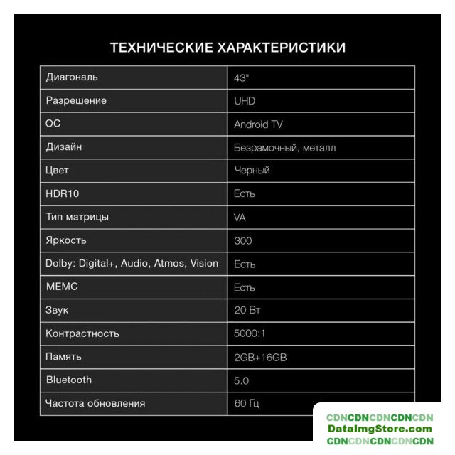 43" 3840x2160 (4K UHD), матрица VA, частота матрицы 60 Гц, Smart TV (Яндекс.ТВ), HDR10, Wi-Fi, смарт пульт