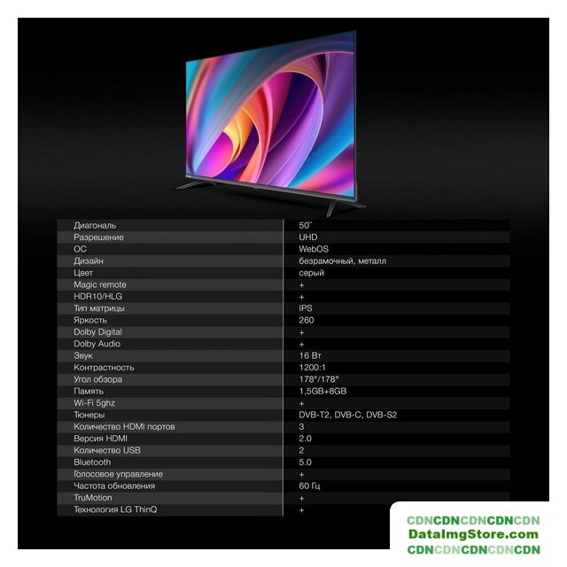 50" 3840x2160 (4K UHD), матрица VA, частота матрицы 60 Гц, Smart TV (LG webOS), HDR10, HLG, AirPlay, Wi-Fi, смарт пульт