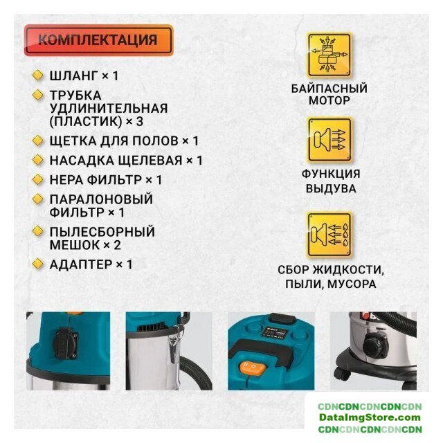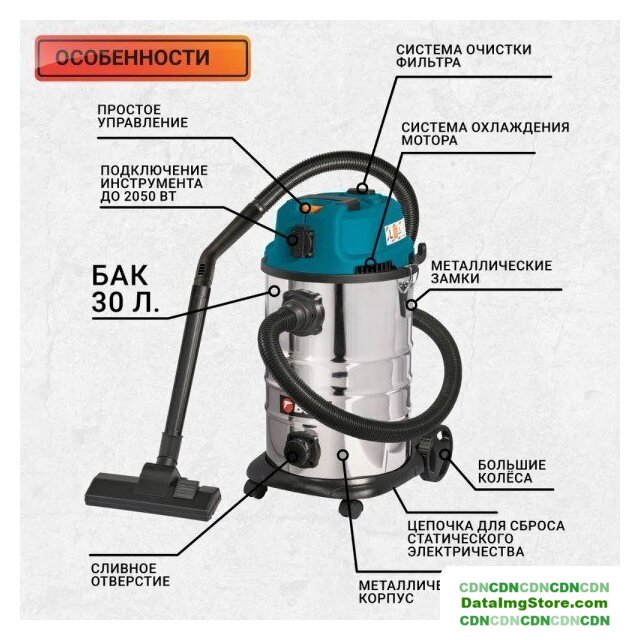 строительный, пылесборник: контейнер, мощность всасывания: 300 Вт, потребление: 1500 Вт, без регулировки мощности, шум 80 дБ