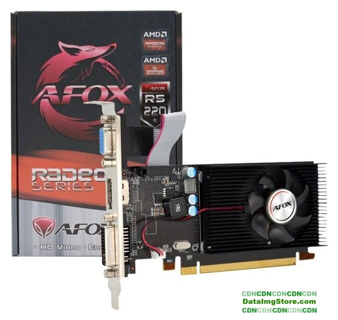 AMD Radeon R5 220, базовая частота 650 МГц, 160sp, частота памяти 1333 МГц, 64 бит, доп. питание: нет, 1 слот, VGA, DVI, HDMI