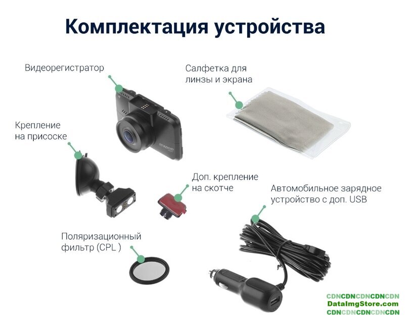 | Комплектация | - видеорегистратор;- поляризационный фильтр (CPL);- крепление на присоске;- доп. крепление на 3М скотче;- автомобильное зарядное устройство;- салфетка для линзы и экрана. |