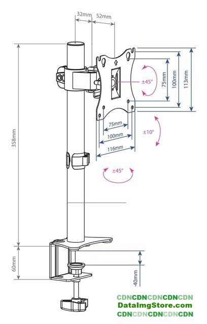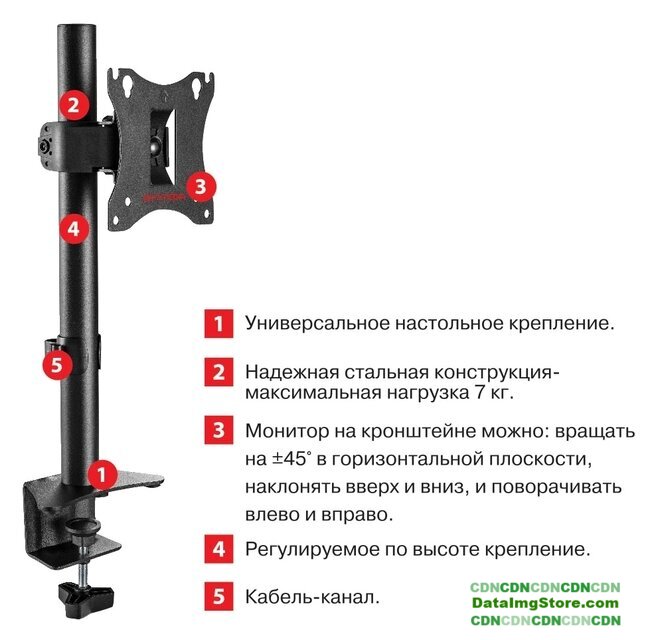 кронштейн для телевизора, 15-32", 2 монитора, к столешнице, с регулировкой поворота, с регулировкой высоты, струбцинное крепление, наклон -90-90°, поворот -90-90°, регулировка высоты 55-405 мм, цвет черный