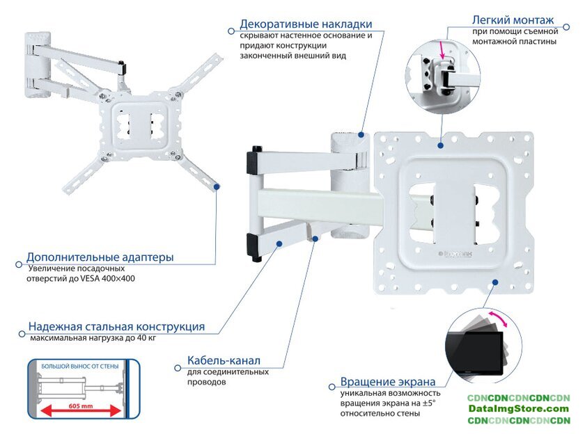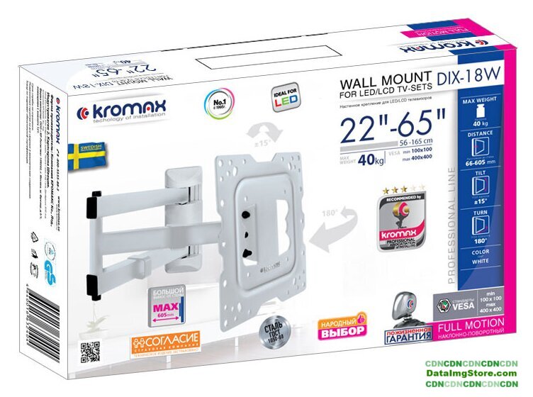 настенный кронштейн для ЖК-телевизора 22-65", наклон 15°, поворот 180°, цвет белый