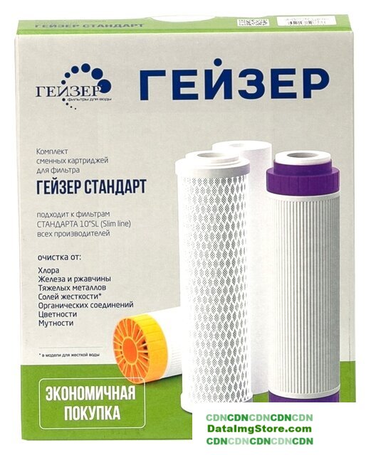 | Описание фильтра | Комплект сменных картриджей для очистки и кондиционирования воды. Очищает воду от хлора, железа, ржавчины, тяжелых металлов, органических соединений, цветности и мутности. Подходит для проточных фильтров Гейзер Стандарт. |