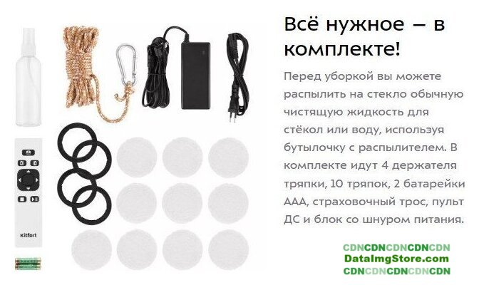 | Комплектация | - пульт ДУ, - документация, - сетевой кабель, - батарейки (2 шт.), - ткань для влажной уборки (10 шт.), - страховочный трос, - кольцо для салфеток (4 шт.), - флакон. |
