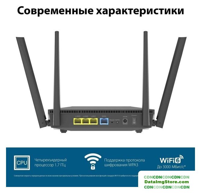802.11ax (Wi-Fi 6), 2.4 ГГц/5 ГГц, до 1500 Mbps, WAN, 4xGigabit LAN